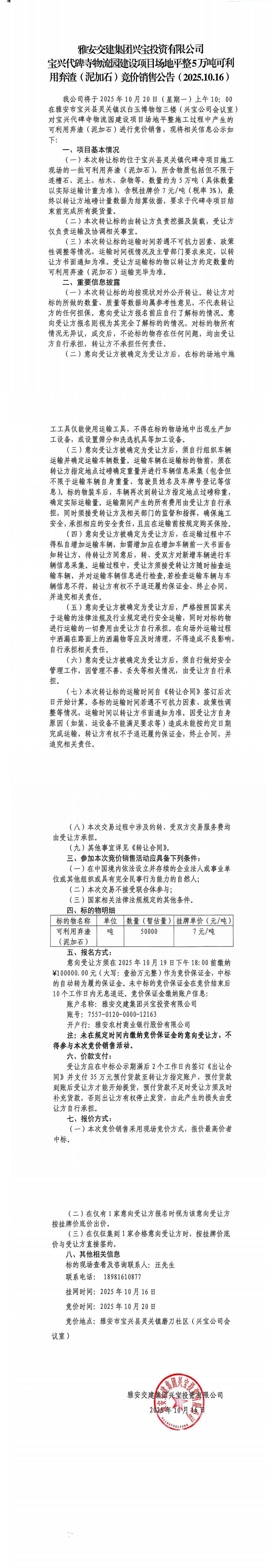 雅安交建集團(tuán)興寶投資有限公司寶興代碑寺物流園建設(shè)項(xiàng)目場(chǎng)地平整5萬(wàn)噸可利用棄渣(泥加石)競(jìng)價(jià)銷售公告(2025.10.16)